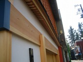 杉板材への塗装は、オスモウッドステインプロテクターで仕上げました。温泉街の街並みに合う外観となりました。